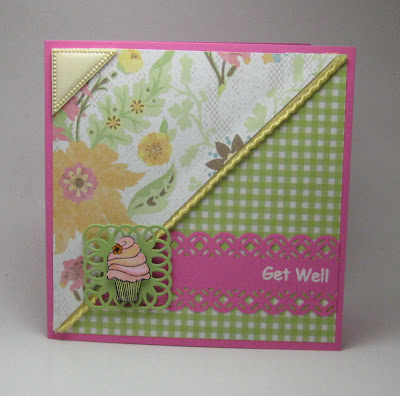 My Mother-In-Law is currently in the hospital and my 3 yr. old niece fell and broke her collarbone so I have a few get wells to send out. I made them very similar but each will be one of a kind for them. For Brynn's I used a cupcake and I divided the DP's in half on a diagonal. The border was made with a Martha Stewart punch & the matte under the cupcake was done with a Cuttlebug die. I used some yellow ribbon to divide the 2 papers and a plastic photo corner on the upper left corner. The Get Well phrase was embossed with opaque white embossing powder so that it would show up really well. The cupcake is colored with Copics. For Barb's card I used the same papers but I stamped flourishes on hers. I stamped the flower 3 times on cream paper and then layered it and used yellow glitter on the center. There's a pink heart pin with 2 paper flowers tied with coordinating green gingham ribbon. I hope these cheer them both up.