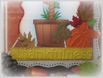I just popped over from the Midnight Madness blog to tell you how pretty I thought your card was. I love all of the leaf embellishments you put in the corner. Very very pretty Thanksgiving card. :D